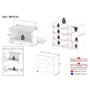 Dimensões do Produto Montado: Berço - Altura: 80,5cm | Largura: 133cm | Profundidade: 77,5cm Cômoda - Altura: 83cm | Largura: 95cm | Profundidade: 42cm *Você pode consultar as medidas detalhadas na imagem técnica do produto.