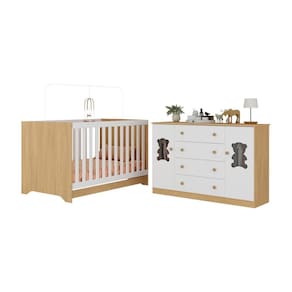 Diferenciais: - 3 anos de garantia contra defeitos de fabricação e material. - Conjunto produzido em madeira de reflorestamento (MDP 12/15mm) com acabamento acetinado (cerca de 20% de brilho): sustentabilidade e durabilidade. - Berço 3 em 1 que se transforma em sofá e minicama, acompanhando o crescimento do bebê. Grade Soft (PVC): ecologicamente correta, com matéria-prima livre de metais pesados, atóxica e com proteção antiamarelamento. - Lastro em madeira com 3 regulagens de altura e suporte para mosquiteiro para noites mais tranquilas e protegidas. - Berço certificado pelo INMETRO (Selo n 000085/2018). - Padrão americano (tamanho do colchão indicado: 130x70cm). Colchão não incluso. - Cômoda com 2 portas, 4 gavetas (frontais em MDF) e rodapé: amplo espaço interno e elegância. - Sistema antitombamento na cômoda: proporciona segurança para o bebê e tranquilidade aos pais. - Portas com detalhes de vidro incolor temperado (3mm): toque charmoso que permite visualizar o interior do móvel. - Corrediças telescópicas: abertura total e silenciosa das gavetas. - Cabideiro de alumínio: permite acomodar as roupinhas para que não amassem. - Puxadores em ABS delicados e práticos.