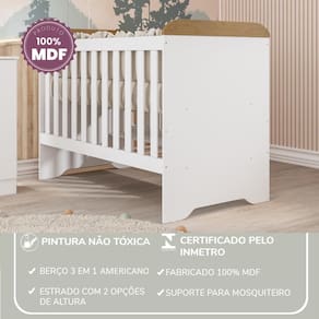 O Berço 3 em 1 Americano foi desenvolvido para oferecer máxima segurança, praticidade e conforto para o bebê. Fabricado em MDF com grades em PVC altamente resistentes, pintura atóxica e certificação INMETRO, este berço garante um ambiente tranquilo, seguro e durável para acompanhar todas as fases da criança.