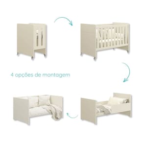 Sua transformação é simples e versátil: começa como mini berço, perfeito para os primeiros meses de vida, garantindo um sono seguro e confortável para o bebê. Depois, pode ser convertido em berço tradicional, oferecendo espaço e segurança conforme a criança cresce. Em seguida, o berço se transforma em um sofá, ideal para momentos de lazer e relaxamento. Por fim, ele pode ser convertido em uma caminha para crianças, proporcionando um local aconchegante e seguro para o descanso.