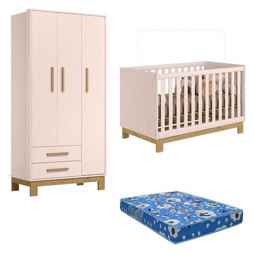 Berço Americano 4315 e Guarda Roupa 4340 Q Encanto Slim Rosa Acetinado com Colchão Ortobom – Qmovi