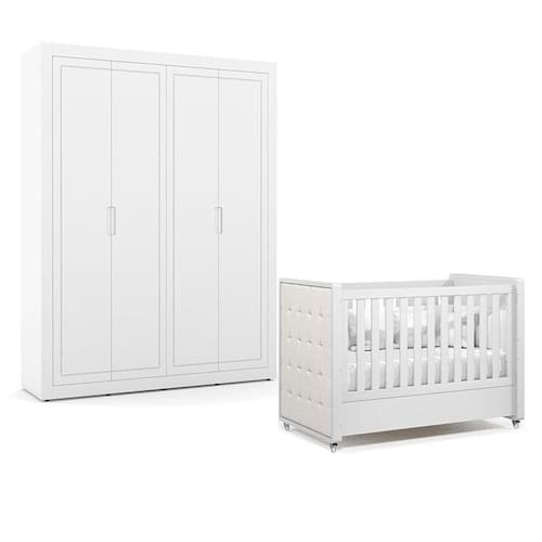 Berço Americano com Capitonê New Boucle e Guarda Roupa Tutto New 4 Portas Branco Acetinado - Matic