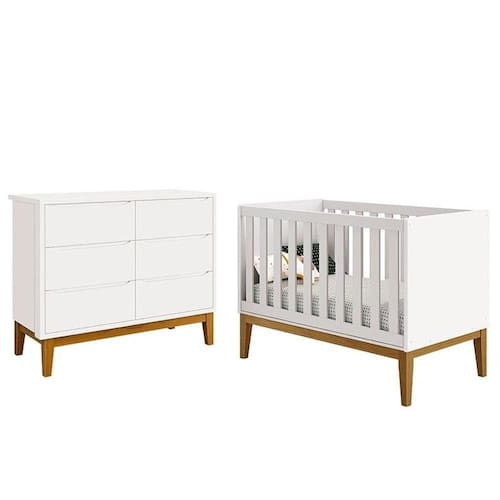 Berço Americano com Cômoda 6 Gavetas New Classic Branco com Pés Madeiras Reller