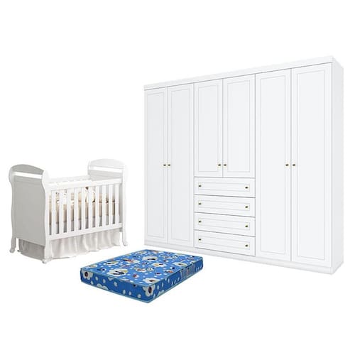 Berço Americano Danny Branco Acetinado Reller e Guarda Roupa Casal Americano 6 portas Branco HP com Colchão Ortobom - Henn.