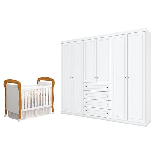 Berço Americano Danny Branco Acetinado Savana Reller e Guarda Roupa Casal Americano 6 portas Branco HP - Henn.
