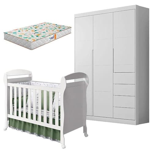 Berço Americano Danny e Guarda Roupa Infantil Eloá Branco Acetinado com Colchão Gazin Phoenix Baby