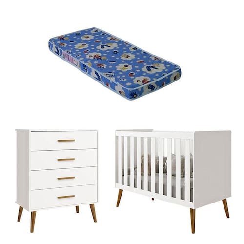 Berço Americano e Cômoda Gaveteiro Infantil Isis Branco Acetinado com Colchão Ortobom - Reller