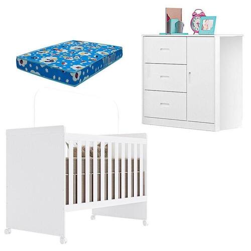 Berço Americano e Cômoda Infantil Lívia Branco Brilho com Colchão Ortobom Canaã