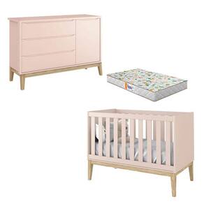 Berço Americano e Cômoda New Classic Rosa com Pés Madeira Natural e Colchão Gazin – Reller