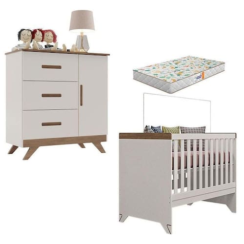 Berço Americano e Cômoda Retro Maya Off White Carvalho com Colchão Gazin Canaã