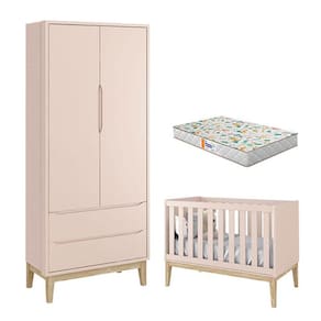 Berço Americano e Guarda Roupa 2 Portas New Classic Rosa com Pés Madeira Natural e Colchão Gazin – Reller