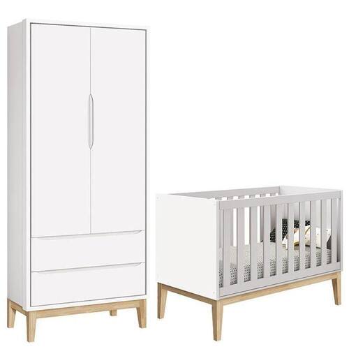 Berço Americano e Guarda Roupa Classic 2 Portas Branco com Pés Madeira Natural ? Reller