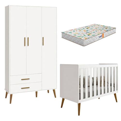 Berço Americano e Guarda Roupa Infantil 3 Portas Isis Branco Acetinado com Colchão Gazin - Reller