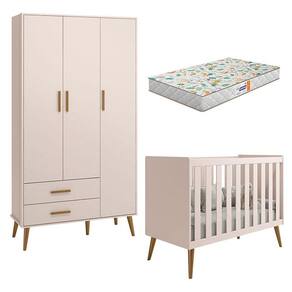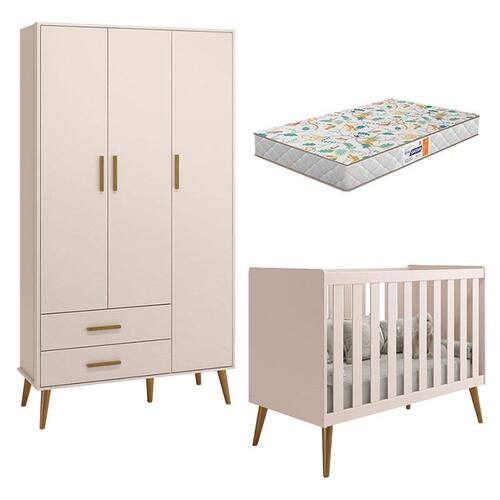 Berço Americano e Guarda Roupa Infantil 3 Portas Isis Rosa Acetinado com Colchão Gazin - Reller