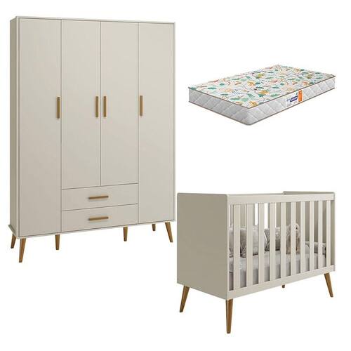Berço Americano e Guarda Roupa Infantil 4 Portas Isis Areia Acetinado com Colchão Gazin - Reller