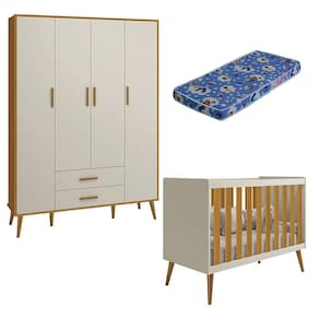 Berço Americano e Guarda Roupa Infantil 4 Portas Isis Areia Acetinado Savana com Colchão Ortobom - Reller