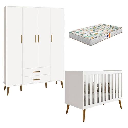 Berço Americano e Guarda Roupa Infantil 4 Portas Isis Branco Acetinado com Colchão Gazin - Reller