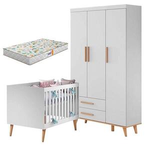 Berço Americano e Guarda Roupa Infantil Ludmila Branco Bétula com Colchão Gazin Carolina