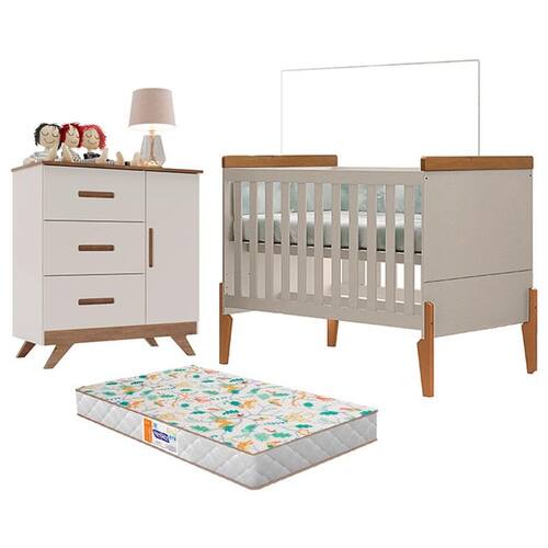 Berço Americano Emilly e Cômoda Infantil Retro Maya Off White Carvalho com Colchão Gazin - Canaã