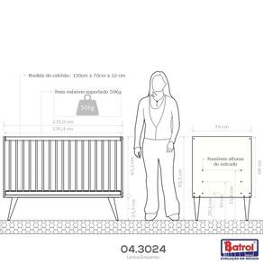 Características: - Produto em: MDP de 15 e 25 mm e MDF de 6 mm - Indicado para colchões: 70x130 cm -não incluso- - Não acompanha suporte para mosquiteiro - 04 pés formato cônico em madeira de 25 mm - Acabamento pintura: Brilho - Suporte de peso 50 kg - Grade fixa - Possui 3 posições de estrado - Garantia de 12 meses