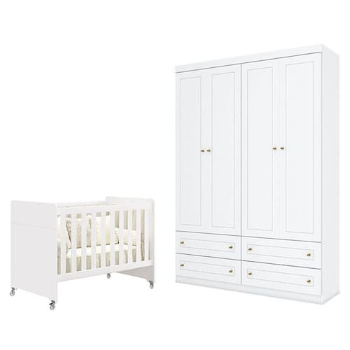 Berço Americano Evolution 4 em 1 Branco Acetinado e Guarda Roupa Infantil Americano 4 Portas Branco - Henn