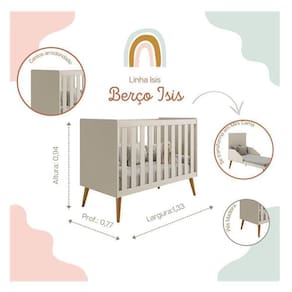 Para proporcionar conforto, e modernidade no quartinho do seu bebê, apresentamos o Berço Americano Isis fabricado pela Reller com estrutura em MDF, design sofisticado, três níveis de altura no estrado e função mini cama para acompanhar as fases de crescimento, aproveite!