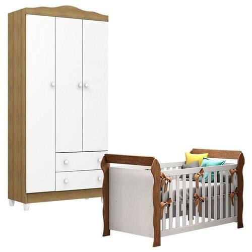 Berço Americano Lara com Guarda Roupa Infantil Mel Flat 3 Portas Branco Acetinado Amadeirado Carolina