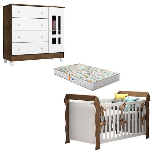 Berço Americano Lara e Cômoda Ariel Branco Acetinado Amadeirado com Colchão Gazin Carolina