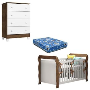 Berço Americano Lara e Cômoda Gaveteiro Ariel Branco Acetinado Amadeirado com Colchão - Carolina