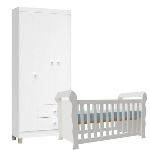 Berço Americano Lara e Guarda Roupa Ternura Baby 3 Portas Branco Brilho - Incorplac