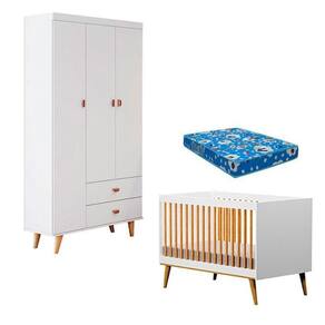 Berço Americano Ligia com Guarda Roupa 3 Portas Duda Branco Acetinado Bétula e Colchão Ortobom Carolina Móveis