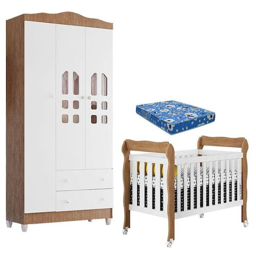 Berço Americano Lila e Guarda Roupa Infantil New Selena 3 Portas Branco Acetinado Amadeirado com Colchão Ortobom Carolina Móveis