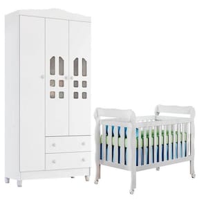 Berço Americano Lila e Guarda Roupa Infantil New Selena 3 Portas Branco Brilho Carolina Móveis