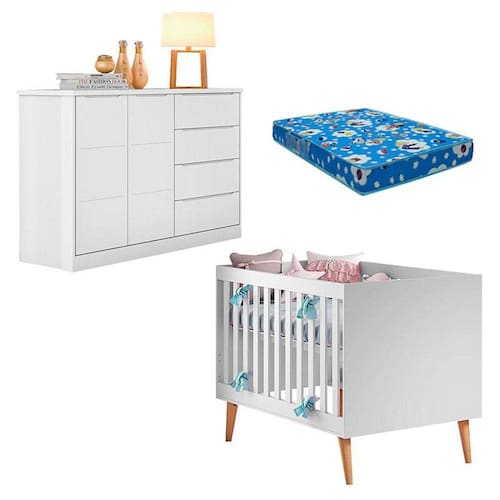 Procurando por moveis para o quartinho do bebê, apresentamos a vocês o Berço Americano Ludmila desenvolvido pela Carolina pensando no conforto do bebê, e a Cômoda Infantil Blenda possui 2 portas e 4 gavetas conta com amplo espaço interno para melhor organização, desenvolvida pela Phoenix com lindo design na cor Branco Acetinado proporcionando tranquilidade e modernidade ao ambiente, e ainda acompanha Colchão Ortobom. Aproveite e garanta já o seu!