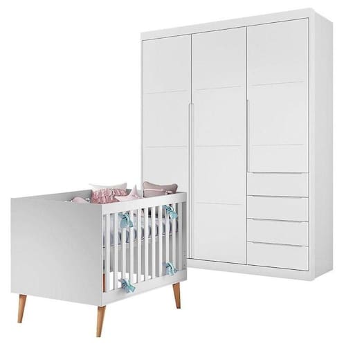 Procurando por moveis para o quartinho do bebê, apresentamos a vocês o Berço Americano Ludmila desenvolvido pela Carolina pensando no conforto do bebê, e o Guarda Roupa Infantil Blenda possui 3 portas e 4 gavetas conta com amplo espaço interno para melhor organização, desenvolvido pela Phoenix com lindo design na cor Branco Acetinado proporcionando tranquilidade e modernidade ao ambiente. Aproveite e garanta já o seu!