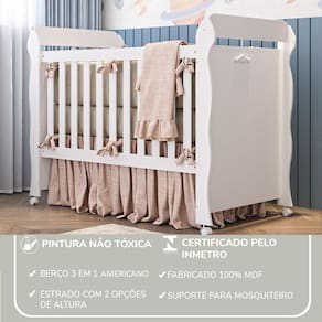 O Berço Mini Cama Americano foi desenvolvido para proporcionar segurança, conforto e durabilidade desde os primeiros meses do bebê até a fase de transição para a mini cama. Produzido em 100% MDF, com pintura UV atóxica e certificação do INMETRO, é a escolha ideal para pais que buscam tranquilidade e qualidade no quarto infantil.