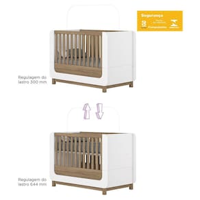 O Berço Americano Mini Cama Aconchego é ideal para quem busca segurança, conforto e praticidade no quarto do bebê. Com estrutura em MDF e MDP e pintura UV atóxica com acabamento brilho, oferece resistência e um visual delicado. Possui padrão americano, cabeceira com bordas arredondadas e grade em MDF com espaçamento de 5,8 cm entre as barras, garantindo mais proteção. Conta com duas regulagens de altura do estrado e pode ser transformado em mini cama, acompanhando o crescimento da criança. Certificado pelo INMETRO (003448/2024), utiliza colchão 70 x 130 cm (não incluso) e possui pés em MDF revestido, assegurando estabilidade e durabilidade.