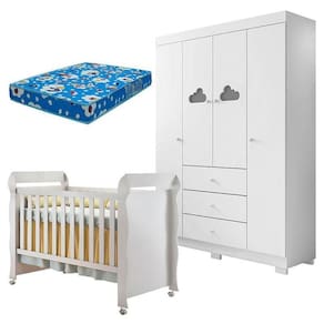 Berço Americano Mirelle e Guarda Roupa Infantil Ane Branco Brilho com Colchão Ortobom Phoenix Baby