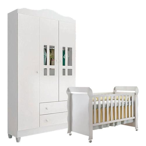 Berço Americano Mirelle e Guarda Roupa Infantil Ariel 3 Portas Branco Brilho - Carolina