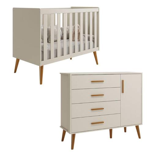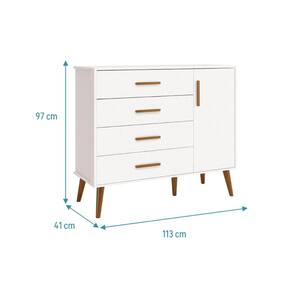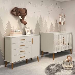 Funcional e encantadora, possui 4 gavetas com puxadores em madeira, 1 porta com prateleira interna, sistema antitombamento e amplo espaço para organizar as roupas do bebê.