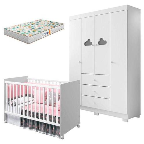 Berço Americano Tico e Guarda Roupa Infantil Ane Branco Brilho com Colchão Gazin Phoenix Baby