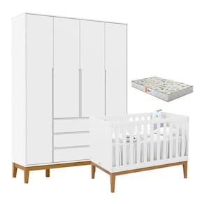Berço Americano Unique e Guarda Roupa 4 Portas Nature Clean Branco Soft Eco Wood com Colchão Gazin – Matic