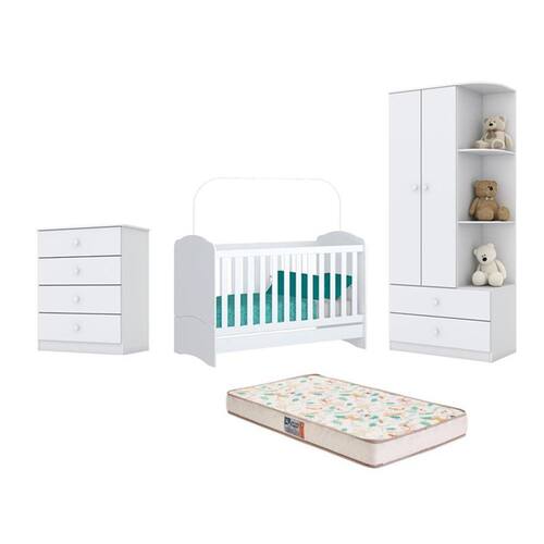 Berço Bala de Menta e Cômoda Labirinto e Guarda Roupa Labirinto Branco + Colchão