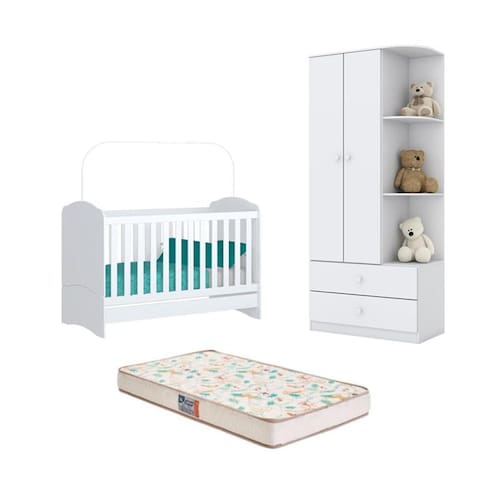 Berço Bala de Menta e Guarda Roupa Labirinto Branco + Colchão