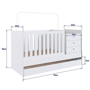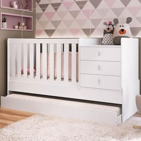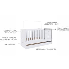 O Berço Cama Multifuncional com Auxiliar Branco Completa Móveis é versátil e elegante, com características que destacam o berço. Quando montado em berço contém uma mini cômoda e apoio para o trocador. É possível, também, ser transformado em uma cama solteiro, que é perfeita para quando seu bebê estiver crescidinho. Produto certificado pelo INMETRO. Use um pano levemente umedecido com água, seguido de pano seco. Não utilize produtos químicos ou abrasivos.
