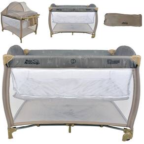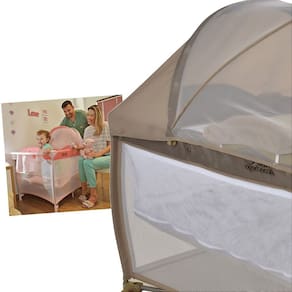 O modelo inclui trocador, capota com mosquiteiro, porta-objetos e rodas com freios. As laterais em tela garantem ventilação e visibilidade durante o uso. O fechamento é compacto, ideal para ambientes com pouco espaço ou para transporte em viagens.