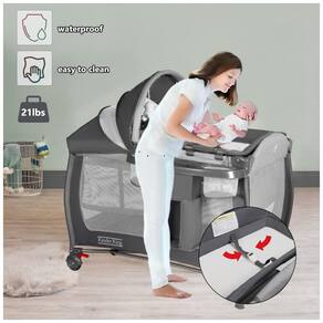 PLAYARD MULTIFUNCIONAL: A luxuosa creche de retiro testemunhará o crescimento do seu filho. Os pais podem facilmente trocar fraldas para recém nascidos no trocador sem se curvar. À medida que o seu filho cresce, o berço infantil de tamanho grande oferece mais espaço para o seu bebê descansar e dormir. As crianças podem subir ou caminhar alegremente no pátio de recreação. PROJETO DE VIAGEM PORTÁTIL: O berço de viagem também inclui uma bolsa de transporte, adequada para viagens em família ou visitas de amigos. Pode ser em ambientes internos e externos. As duas rodas deslizam suave e silenciosamente sem danificar o chão. Em pé, as rodas podem ser travadas com um clique. O organizador de fraldas pode ser para guardar as necessidades diárias do seu bebê. ESPAÇO DIVERTIDO E ESPAÇOSO: O design de malha de quatro lados garante a circulação de ar e é conveniente para os pais observarem seu bebê. O tecido Oxford é confortável e respirável. Colchão removível é macio e protege a coluna do bebê. O dossel ajustável vem com lindos brinquedos giratórios para entreter o bebê e atrair sua atenção. ESTRUTURA SEGURA E ESTÁVEL: O tubo de ferro sólido dá ao bebê um suporte estável. O envoltório de tecido grosso e os cantos elegantes à prova de choque ao redor mantêm as crianças longe de colisões acidentais. A mesa de fraldas também está equipada com cintos de segurança. SIMPLES DE MONTAR E DOBRAR: Leia atentamente nossas instruções antes de montar e dobrar o pack n play. A montagem e desmontagem não necessita de ferramentas. O pano TD de alta resistência é adequado para dobras múltiplas. É uma ótima opção para chás de bebê, presentes de aniversário, Natal e outros feriados