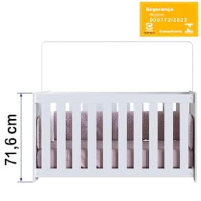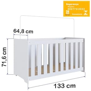 Berço Infantil certificado pelo INMETRO n 000772/2022, além de ser um produto versátil e multifuncional, conta com um design lindo e sofisticado, deixando o ambiente ainda mais moderno e aconchegante. Estrutura em MDP de 15 mm, feito com material ecologicamente correto, para melhor durabilidade e resistência à peça, e excelente acabamento Finish Foil (Fosco). Composto por estrado em MDF de 6 mm com altura regulável em três opções: 1: 9 cm 2: 23 cm e 3: 38 cm, travessas em MDF de 15 mm, grades fixas em MDF de 12 mm, com espaço entre elas de 5,5 cm e acabamento em BP, e acompanha suporte para mosqueteiro. Colchão Infantil certificado pelo INMETRO n 165171/22, com espuma 100% poliuretano, densidade D18, tecido lateral tem um dos tampos em Poliéster e o outro tampo do colchão é em Plavinil que inibe a de líquidos na espuma aumentando assim a vida útil do produto. O colchão indicado é de 130x60 cm (Acompanha Colchão). Suporta até 30 kg distribuídos. Este móvel chegará em sua casa separado em 02 volumes.