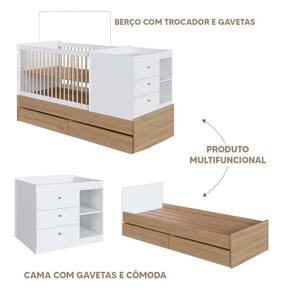 O Berço Cama Multifuncional com Gavetões é versátil, prático e elegante, com características que o destacam e literalmente o tornam multifuncional. Inicialmente, utilizado como berço + cômoda trocador na parte lateral. Após o passar do tempo, pode ser desmembrado e utilizado como cama de solteiro + cômoda avulsa ou mesa de cabeceira. Gavetões auxiliares possibilitando mais espaços extras! Grades em Pinus, trazendo leveza e um toque diferenciado no design.