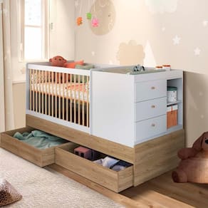 O Berço Cama Multifuncional com Gavetões é versátil, prático e elegante, com características que o destacam e literalmente o tornam multifuncional. Inicialmente, utilizado como berço + cômoda trocador na parte lateral. Após o passar do tempo, pode ser desmembrado e utilizado como cama de solteiro + cômoda avulsa ou mesa de cabeceira. Gavetões auxiliares possibilitando mais espaços extras! Grades em Pinus, trazendo leveza e um toque diferenciado no design.